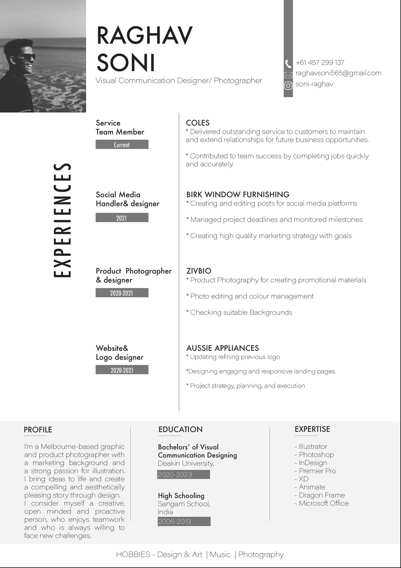 The visual style of this design incorporates my logo and a dark edit of a shot I took in CBD. The traditional cultural inspiration that underpins my creative work, the history of Melbourne’s vintage-style tram, is something I wanted my personal branding to convey in addition to my own identity.